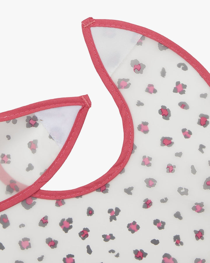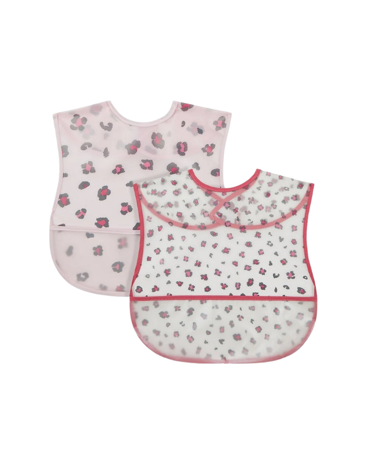 - Pack Includes: 2 crumb catcher bibs in coordinating leopard print designs.