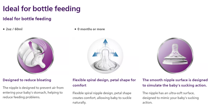 - Wide, breast-shaped nipple promotes natural latch-on, making it easier to combine bottle and breastfeeding.
